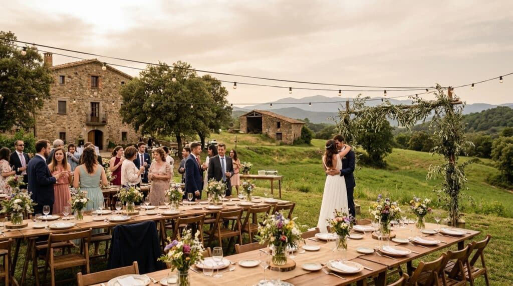 - Flexibilidad horaria: La temida «hora de corte» donde encienden las luces y apagan la música no existe (o es infinitamente más flexible) al casarse en la naturaleza en Cataluña. Al no tener vecinos pared con pared, la fiesta fluye a vuestro ritmo.